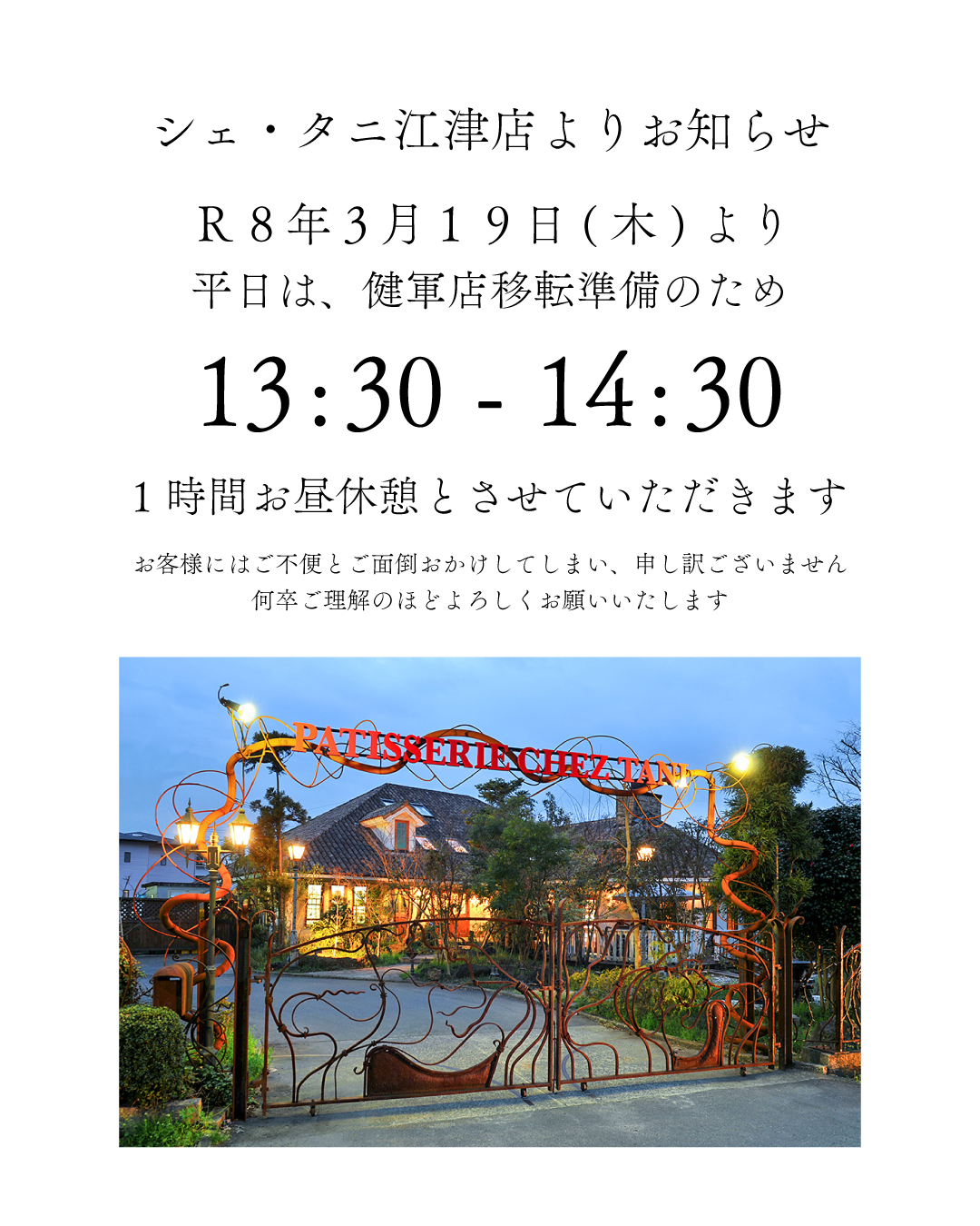江津店、お昼休憩のお知らせ 2026/3/19 いつもシェ・タニをご愛顧いただき誠にありがとうございます。 シェ・タニ江津店よりお知らせです。 3月19日(木)より健軍店移転準備のため、 平日の13:30-14:30の1時間はお昼休憩とさせていただきます。 お客様へはご不便とご面倒をおかけしてしまい申し訳ございません。 ご理解のほど、よろしくお願いいたします。