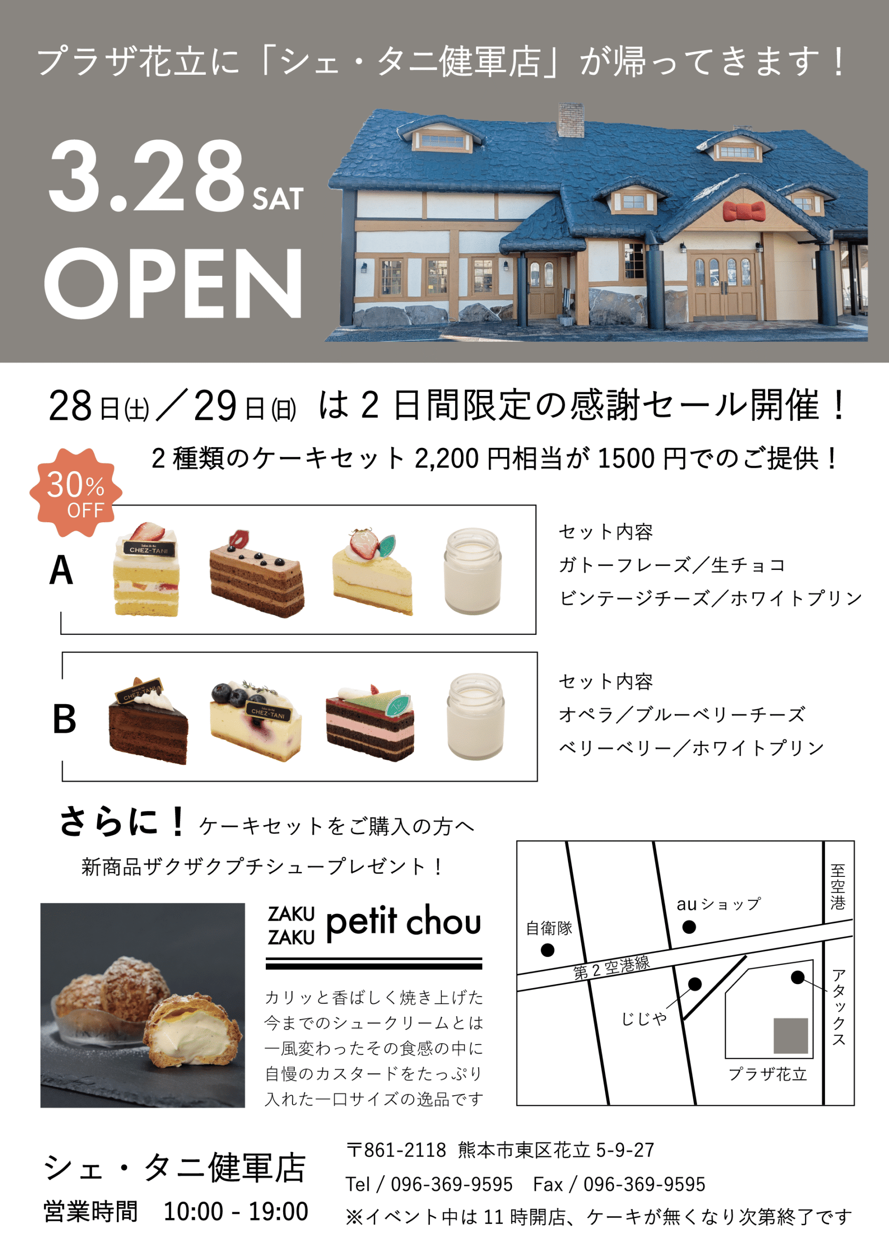 健軍店がプラザ花立に帰ってきます! 2026/3/23 いつもシェ・タニをご愛顧いただき、誠にありがとうございます。 シェ・タニ健軍店は3月28日(土)より 第2空港線沿いの「プラザ花立」にリニューアルオープン! そして、28日〜29日の2日間は感謝セールを開催いたします! お得なこの機会にぜひお買い物をお楽しみください。 皆様のご来店を心よりお待ちしております。