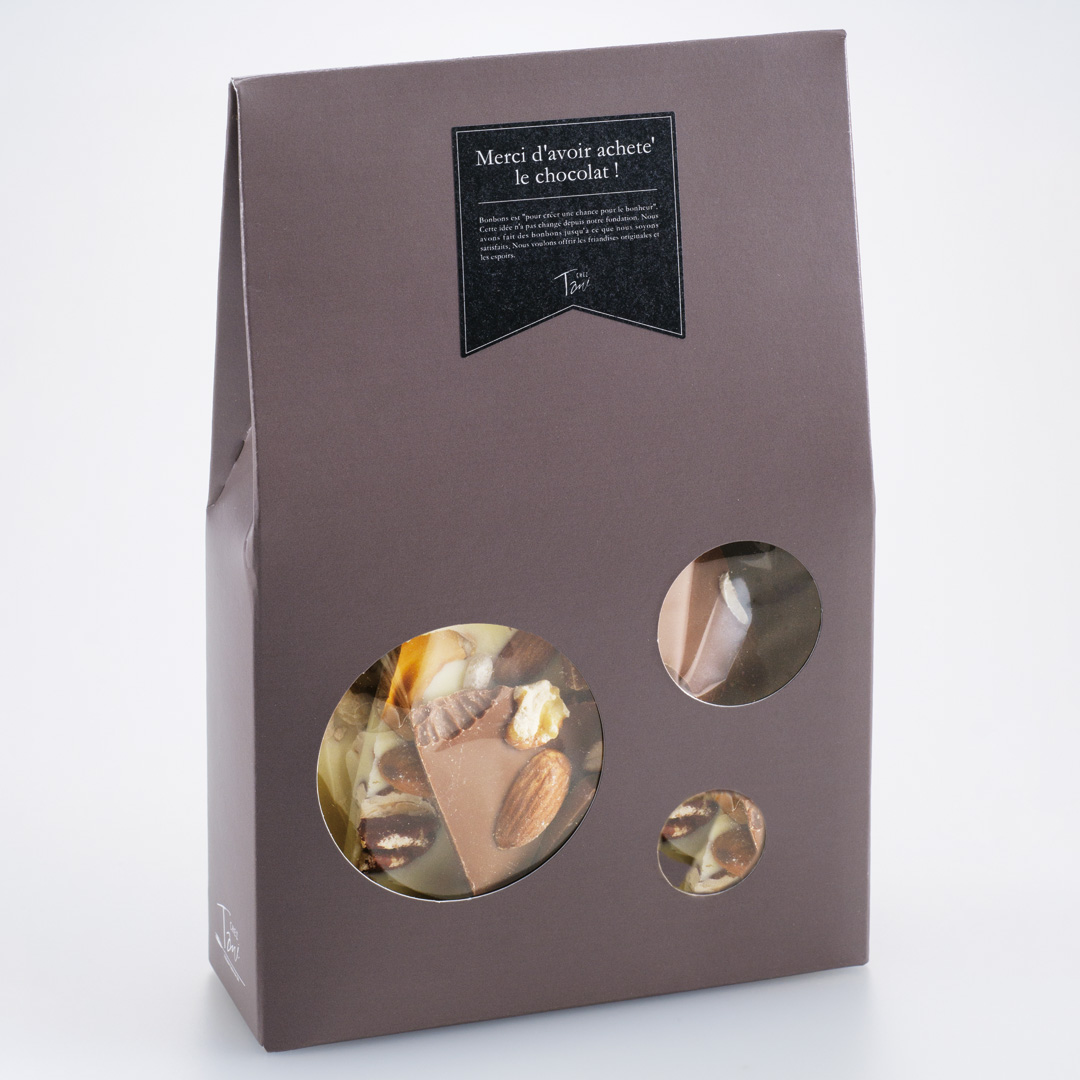 <期間限定商品> 今季の販売は終了致しました。皆様のご愛顧ありがとうございました。 ベルギー産のスウィートチョコとホワイトチョコの上に、複数のナッツをちりばめた贅沢な味わいの期間限定のチョコレートです。 大切な方への贈り物にご利用ください。 税込価格 760円(税込) 特定原材料等 乳、大豆 賞味期限 製造日より17度以下の保存で5カ月(実際にお届けする商品の賞味期限は、在庫状況により短くなりますので何卒ご了承ください。) 栄養成分表示 [100gあたり]熱量606kcal/たんぱく質9.0g/脂質45.7g/炭水化物41.8g/食塩相当量0.02g ご購入について 江津店、健軍店、流団店、鶴屋店、新東京店、瀬の本高原店でお買い求めいただけます。 オンラインショップでもご購入いただけます。
