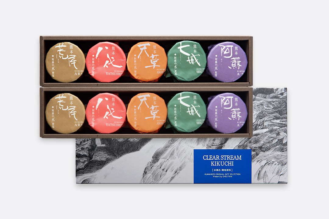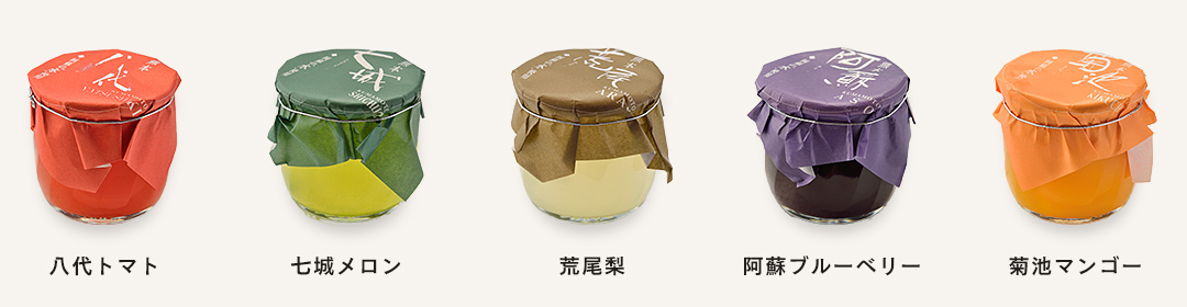 八代トマト、七城メロン、荒尾梨、阿蘇ブルーベリー、天草不知火、この5種類の熊本県産の果実に阿蘇の天然水を使った、ピュアな風味と口あたりが自慢のジュレ。素材のみずみずしさをまるごと閉じ込め、凍らせても極上の美味しさです。
