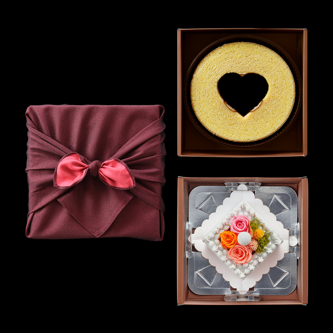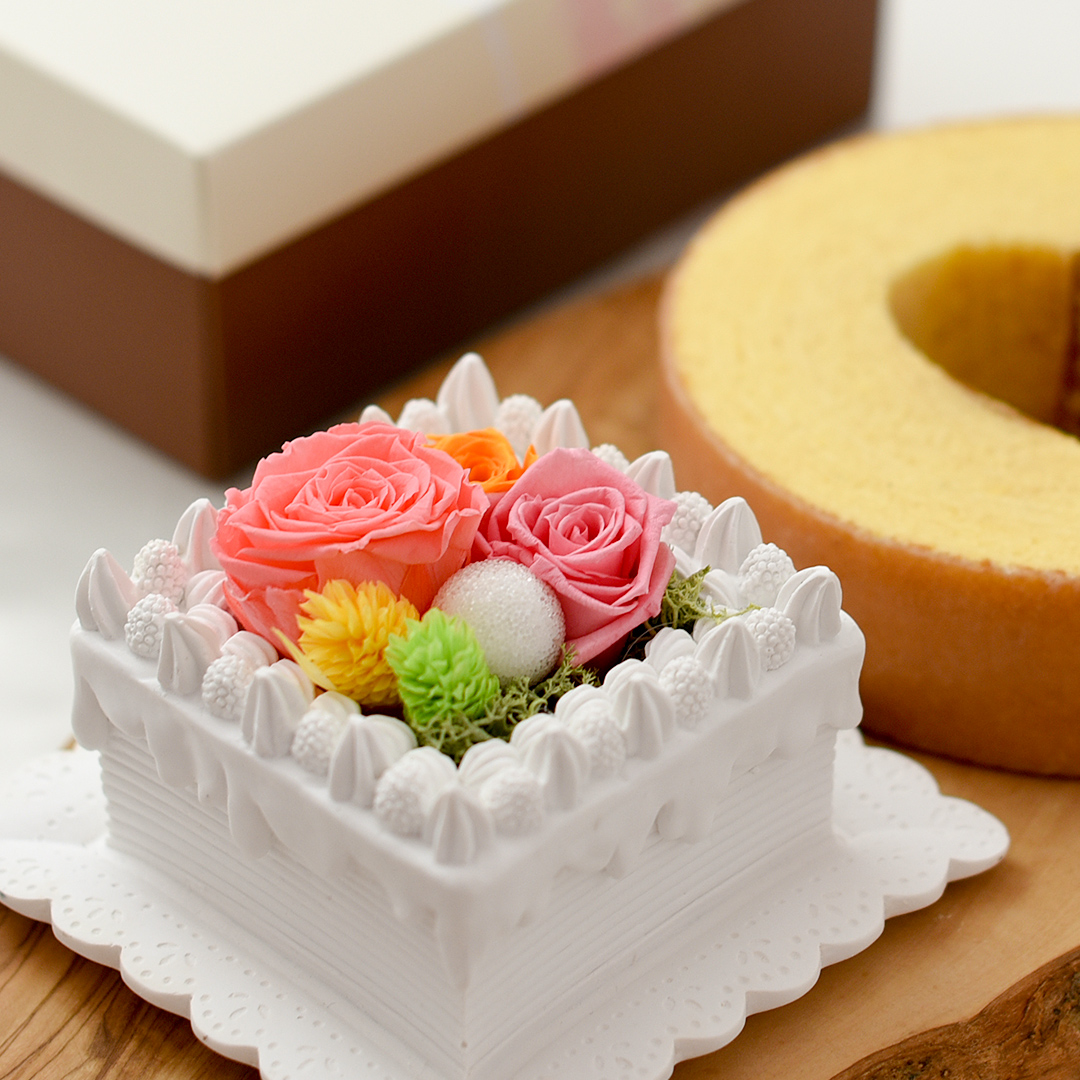 花樵は、プリザーブドフラワーとハート型のバウムクーヘン「こころバム」をセットにした、ギフトに最適な商品です。結婚式の引き菓子にもおすすめです。