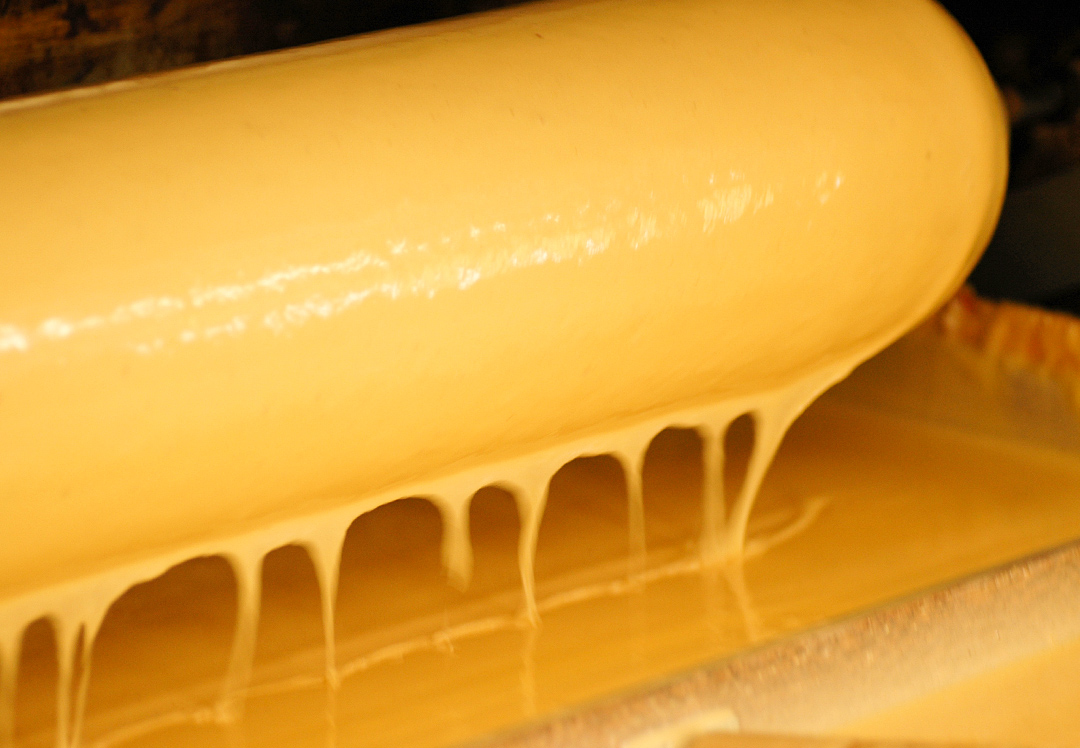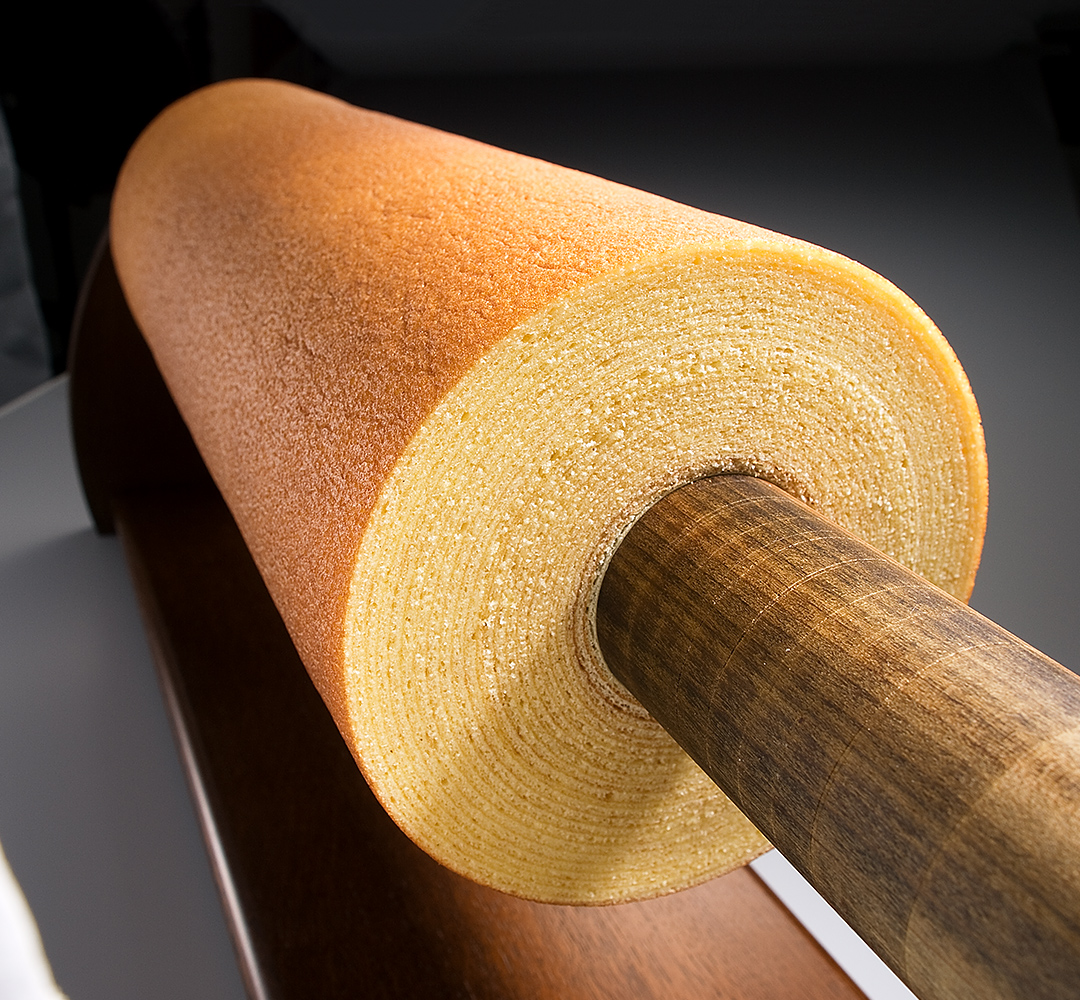 シェ・タニのバウムクーヘンは幾つもの層を薄く丁寧に焼き上げて作られています。ひとつひとつ手作業で、生地を一層ずつ「やわらかな焼き加減」で、巻いていくことで柔らかく、しっとりとした食感のバウムクーヘンができあがります。この「やわらかな焼き加減」は、年輪から確認することができます。しっかり焼くと、焼き色となる年輪は濃くなり、柔らかさも失われることになります。つまり、焼き色が薄いということは、しっとりとしたやわらかさの証拠でもあるのです。