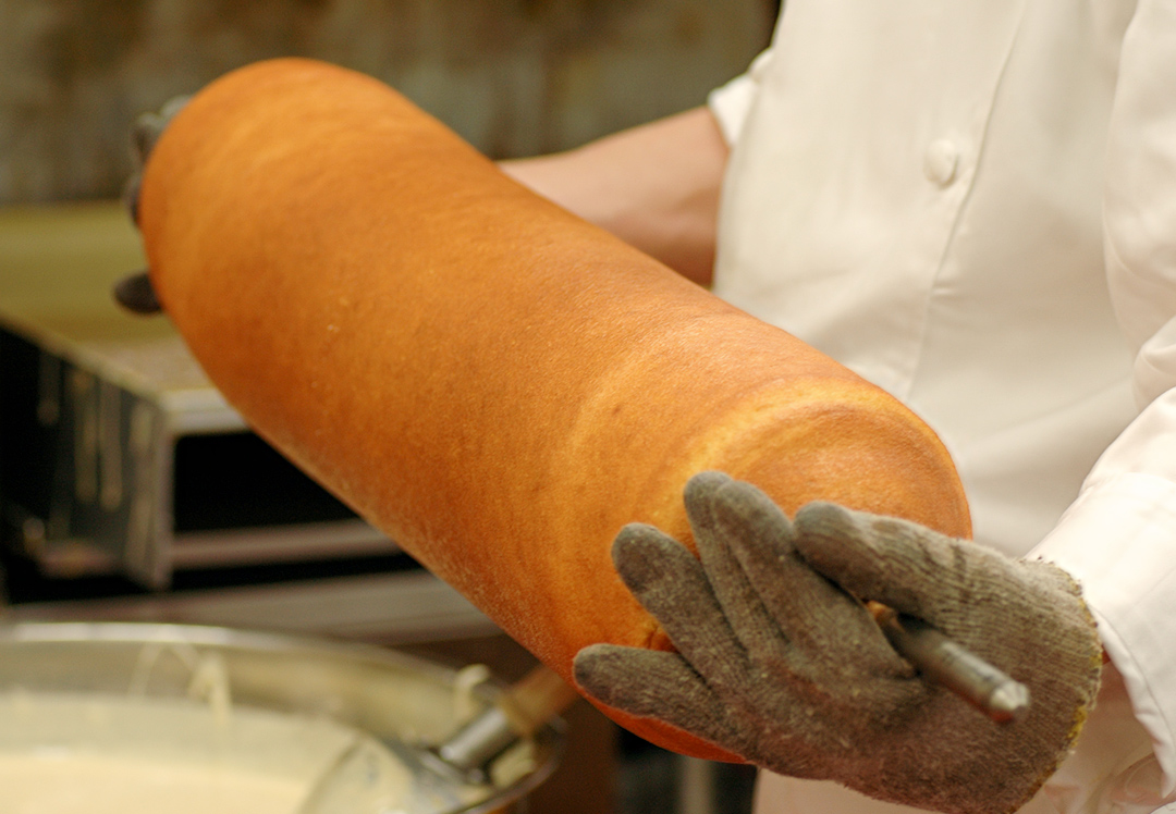 バウムクーヘンは、その製法から一日に作れる個数に限りがある繊細なお菓子です。手間と素材を惜しまず、職人の技術と真心を込め、最高のバウムクーヘンを味わって頂きたいとの思いから、毎日真剣勝負で焼いています。