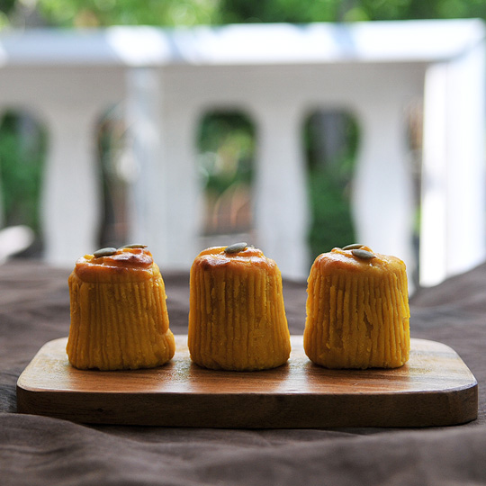 甘みの強い栗かぼちゃにたっぷりの卵黄とバターを混ぜ込みました。ワンポイントにかぼちゃの種をトッピングしたお菓子です。