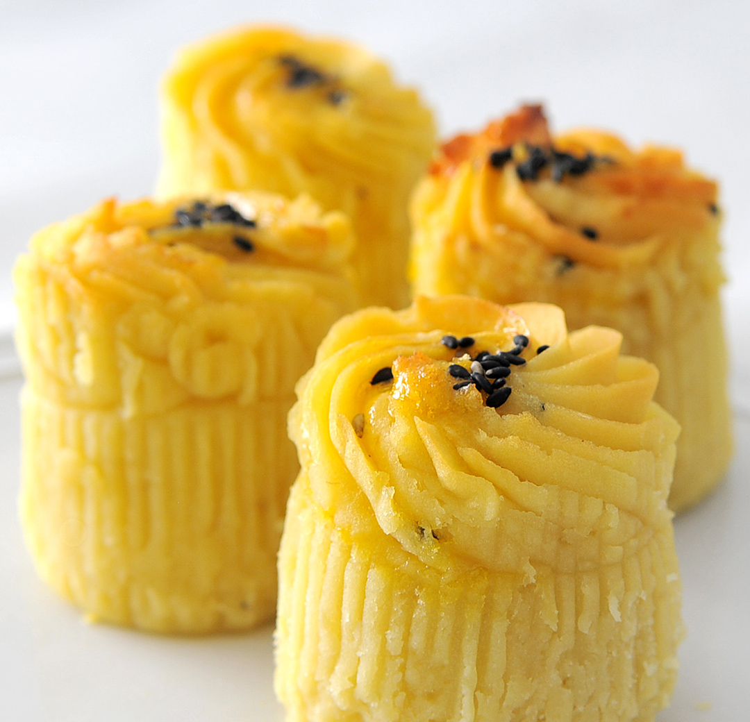 スイートポテトといえば丸い楕円形のものや搾り出してあるサツマイモの洋菓子をご想像されるでしょう。そのタイプのスイートポテトを作ることも出来ますが、チーズと白あんとの組み合わせで、なんとも不思議で美味しい甘藷(さつまいも)のスイーツをつくりました。